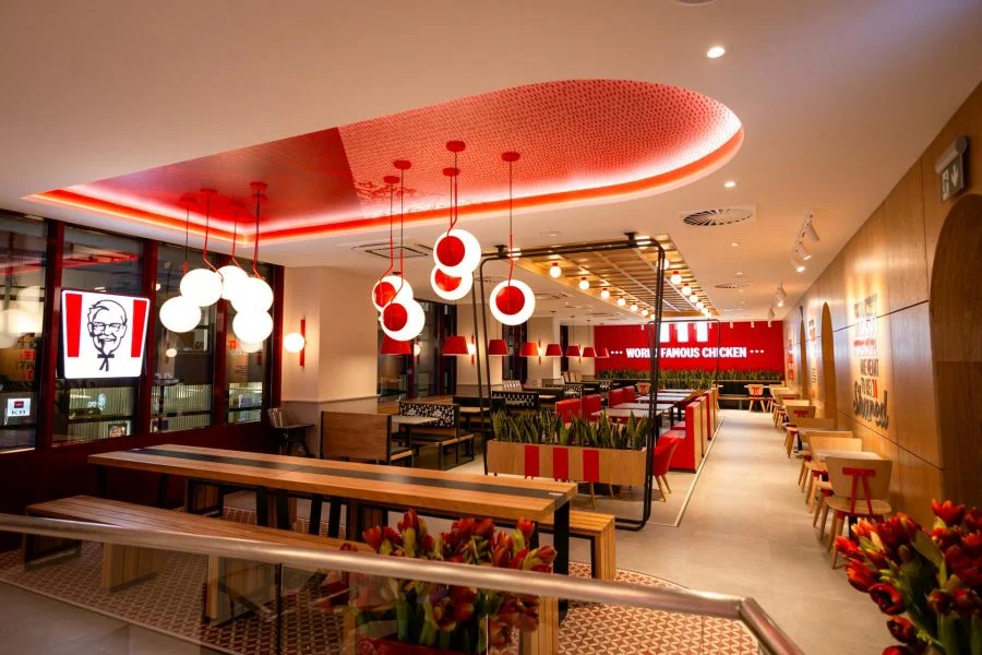 The flagship restaurant in Prague meets stringent requirements that distinguish it from other KFC branches worldwide. It is one of only five such restaurants KFC operates globally. The elegant design combines the building’s historic architecture with modern elements, creating a unique ambience that reflects the atmosphere of Wenceslas Square. The restaurant integrates art deco elements with contemporary design, achieving a harmonious blend of tradition and innovation.