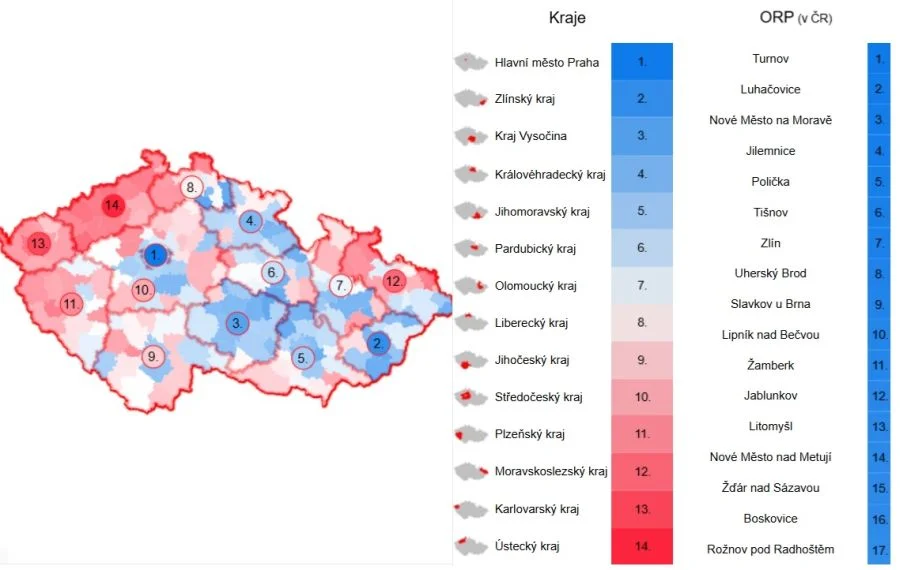 Although Prague leads economically, its ranking is affected by limited access to primary education and a higher crime rate. Overall, the Czech capital ranks 23rd out of 206 micro-regions. However, Prague is the only city in the Czech Republic with dual status—it functions both as a city and a region. If Prague were compared to regions instead of municipalities with extended competences, it would rank first out of 14 regions.