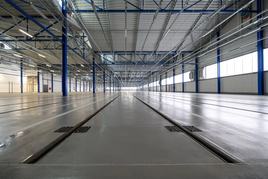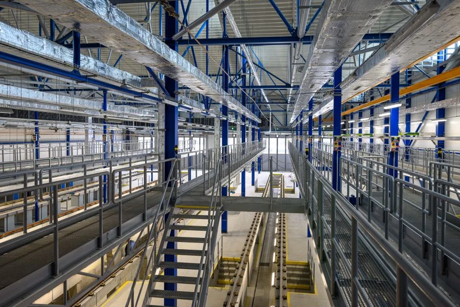 The central part of the new depot is a hall with 22 tracks. It is divided into a storage hall (tracks 1–17), with a capacity for up to 61 articulated trams up to 32 metres in length (such as the 15T model or the 52T currently in production), and a maintenance hall (tracks 18–22) with six stations and capacity for up to 12 articulated vehicles. The two areas are structurally separated, reducing the need for constant heating and lighting, which helps save energy. The parking hall is only heated to around 5°C, while the maintenance hall is equipped with state-of-the-art technology for servicing low-floor trams.