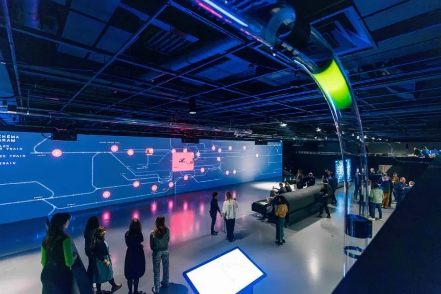 Anyone who wants to step into the role of a train dispatcher can press a button to set a model train in motion – powered by an unusual system: Our “Express” races through CAMP via pneumatic tube. Another highlight is “Sofa 2.0,” which has returned and invites not only for cosy film viewing but also offers an acoustic simulation of future subways or a virtual ride on the Metro Line D.