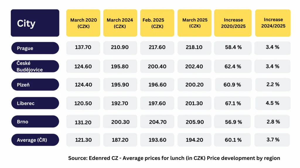 Despite slowing growth in the last quarter, the long-term trend is clear: lunch prices in the Czech Republic have risen significantly over the past five years. In March 2020, the average price stood at CZK 121.30 – today it is more than CZK 72 higher, representing an increase of 60.1%. In Ostrava, the cost of a lunch menu rose by CZK 82.20 over the same period, in Liberec by CZK 80.80, and in České Budějovice by CZK 77.80. Even in regions with more moderate price growth, such as Zlín, the increase amounts to over CZK 56.