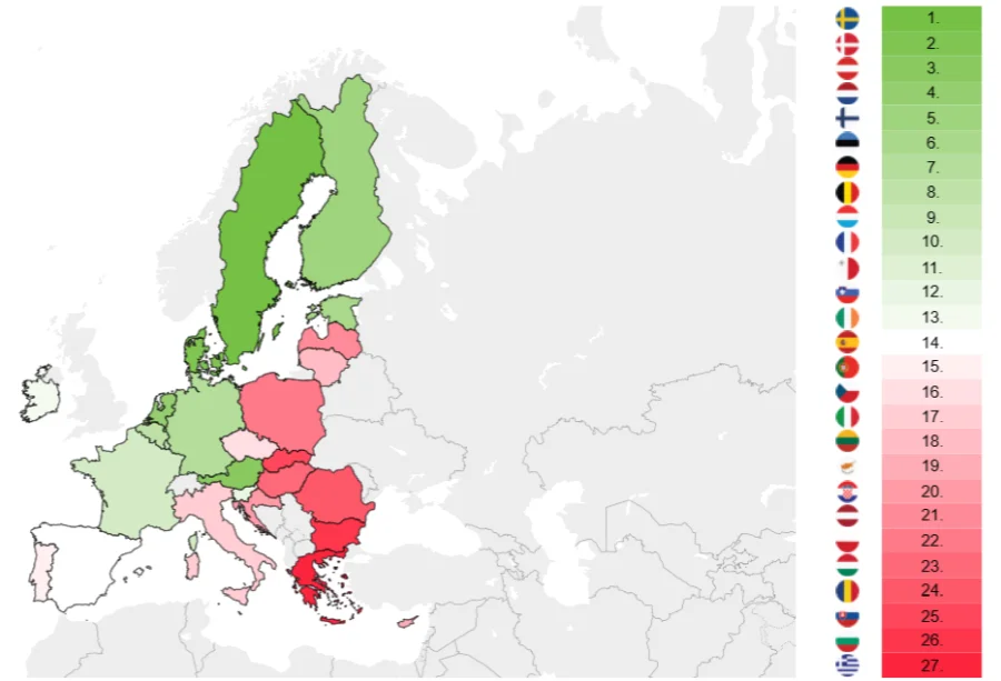 After Sweden and Denmark, Austria enters the top three for the first time, having improved its standard of living across almost half of the indicators. Greece ranks last, Bulgaria second to last, and Slovakia completes the trio of least prosperous countries in the EU at 25th place.