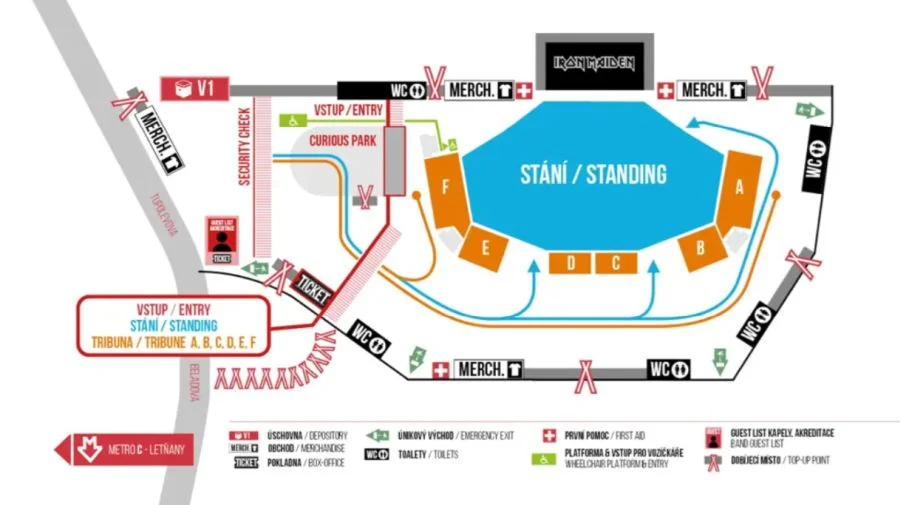 The area around the venue will be closed to traffic. Please do not drive directly to the site. Instead, use one of the P+R car parks on the outskirts of Prague and continue by metro. Letňany station (line C) is directly adjacent to the concert venue and will be served more frequently on the day.