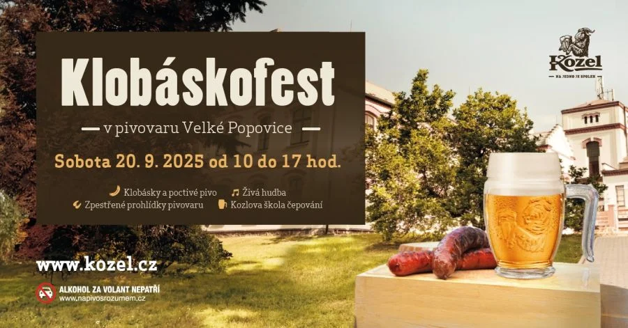 At the end of September, the Kozel Brewery in Velké Popovice invites the public to the traditional Klobáskofest. Guests can enjoy hearty sausage specialities, fresh beer, and a colourful supporting programme with tours and music. Admission is free.