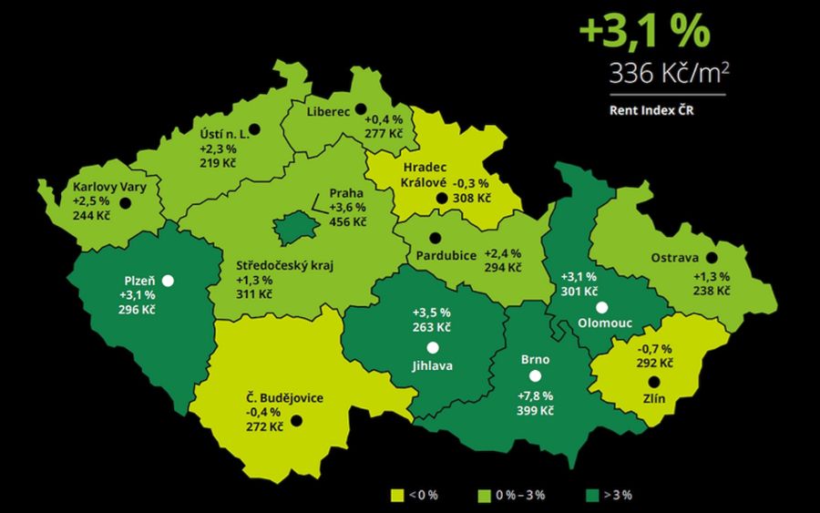 Brno recorded the highest quarter-on-quarter increase: the average rent there rose by 7.8 per cent to 399 crowns per square metre. Prague came second with an increase of 3.6 per cent (456 crowns), followed by Jihlava with a growth of 3.5 per cent to 263 crowns. Only three regional cities reported slight declines – Zlín (−0.7% to 292 crowns), České Budějovice (−0.4% to 272 crowns) and Hradec Králové (−0.3% to 308 crowns).