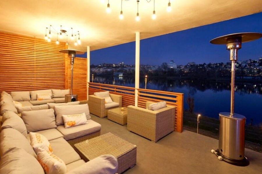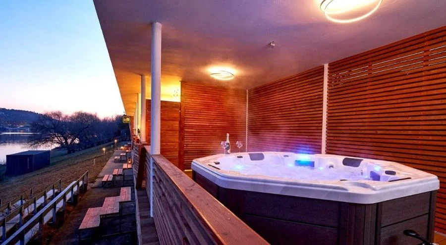 Each sauna is located outdoors but is separated from the others to offer guests optimal privacy. There are also private changing areas and showers on site. After the sauna, guests can enjoy a refreshing dip in the in-house whirlpool and, with a glass of sparkling wine (or beer and cocktails), take in the views of the Vltava.