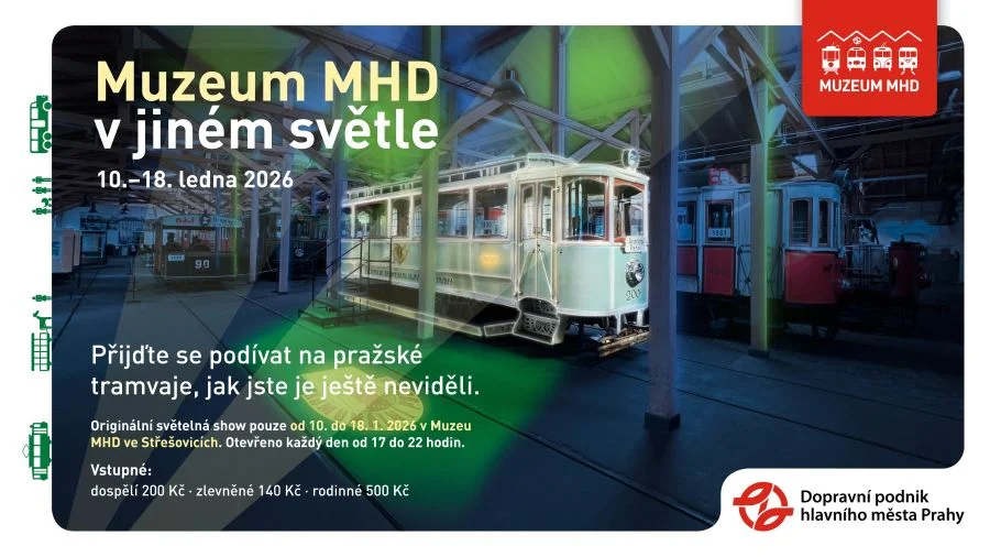 With flickering strobe lights and powerful sound, the Prague Public Transport Company (DPP) has transformed the exhibition rooms of the Museum of Public Transport (MHD) at the Vozovna Střešovice stop into a unique experience. Till Sunday, 18 January 2026, the museum opens daily after sunset to illuminate historic vehicles from the 19th and 20th centuries in a spectacular light and sound show.